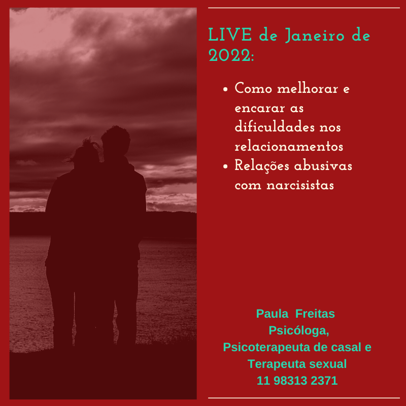 Maratona de LIVE de Janeiro: LIVE 155 – COMO MELHORAR E ENCARAR AS DIFICULDADES NOS RELACIONAMENTOS https://www.youtube.com/watch?v=20-nf28D6WM&t=1462s LIVE 156 – RELAÇÕES ABUSIVAS COM NARCISISTAS https://www.youtube.com/watch?v=HaJ5SngrWjE&t=1219s #livecompsicologa #narcisistas #relacionamentosamorosos #relacionamentospsicologia