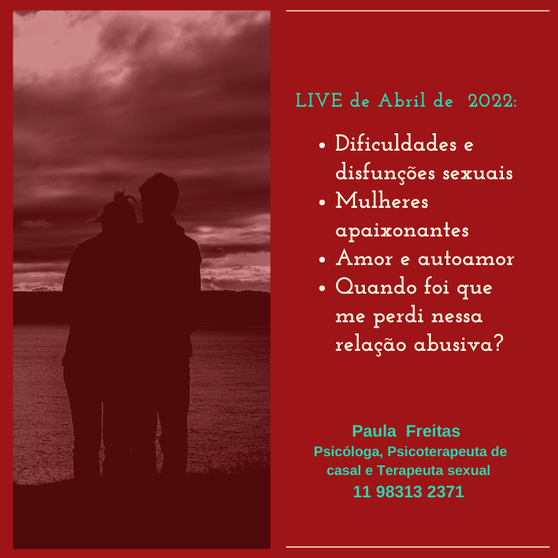 Maratona das LIVE de abril: LIVE 166 – DIFICULDADES E DISFUNÇÕES SEXUAIS https://www.youtube.com/watch?v=1CDpLSwrOV4 LIVE 167 – MULHERES APAIXONANTES https://www.youtube.com/watch?v=z8pQUySC-74&t=1026s LIVE 168 – AMOR E AUTOAMOR https://www.youtube.com/watch?v=mLO71DhLU1M&t=629s LIVE 169 – QUANDO FOI QUE ME PERDI NESSA RELAÇÃO ABUSIVA? https://www.youtube.com/watch?v=jNyE2N5qqeI&t=1079s #livecompsicologa #relacionamentospsicologia