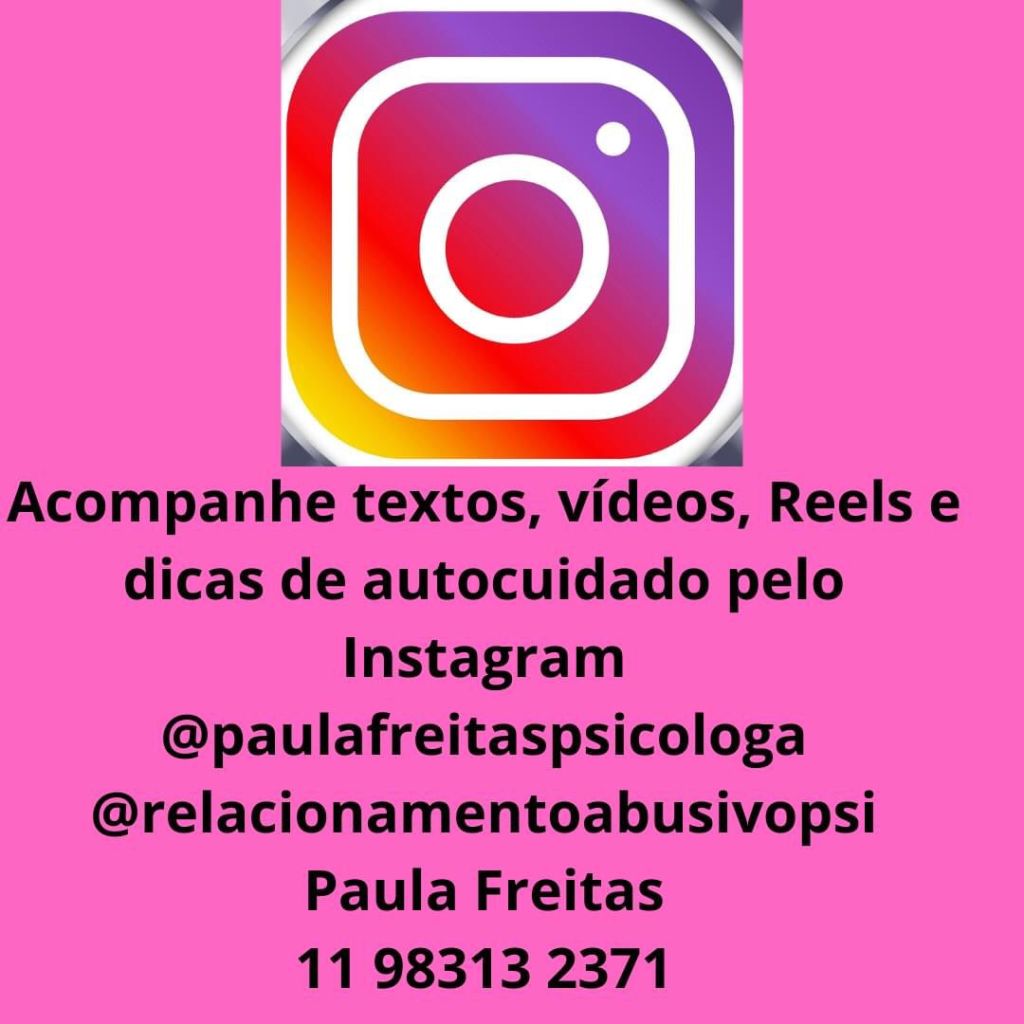 Venha curtir meus post diários no Instagram https://www.instagram.com/paulafreitaspsicologa/ https://www.instagram.com/relacionamentoabusivopsi/ @Paula Freitas Psicóloga @relacionamentoabusivopsi