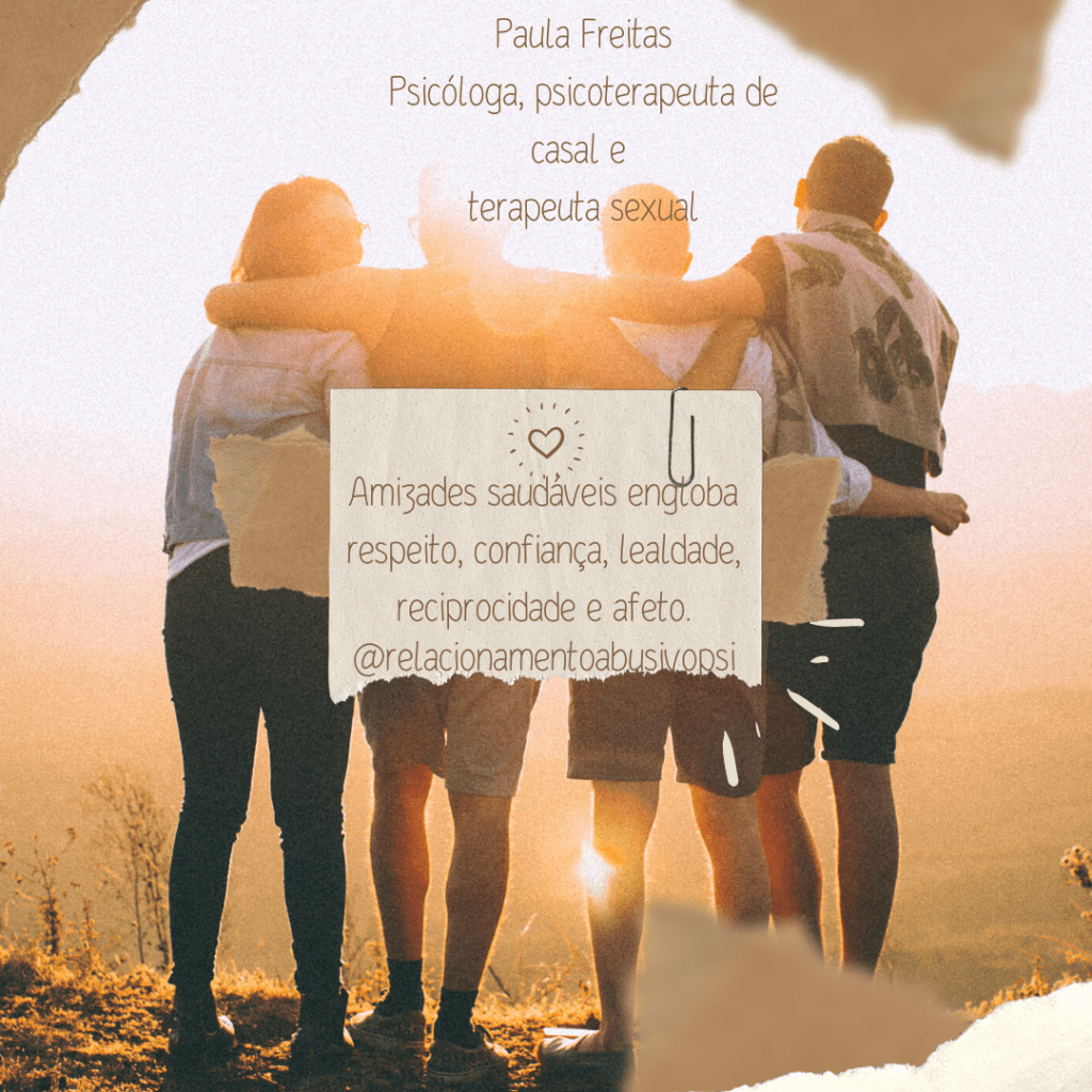 Amizades saudáveis engloba respeito, confiança, lealdade, reciprocidade e afeto. Um bom amigo sabe até onde pode ir, sem invadir o espaço do outro.