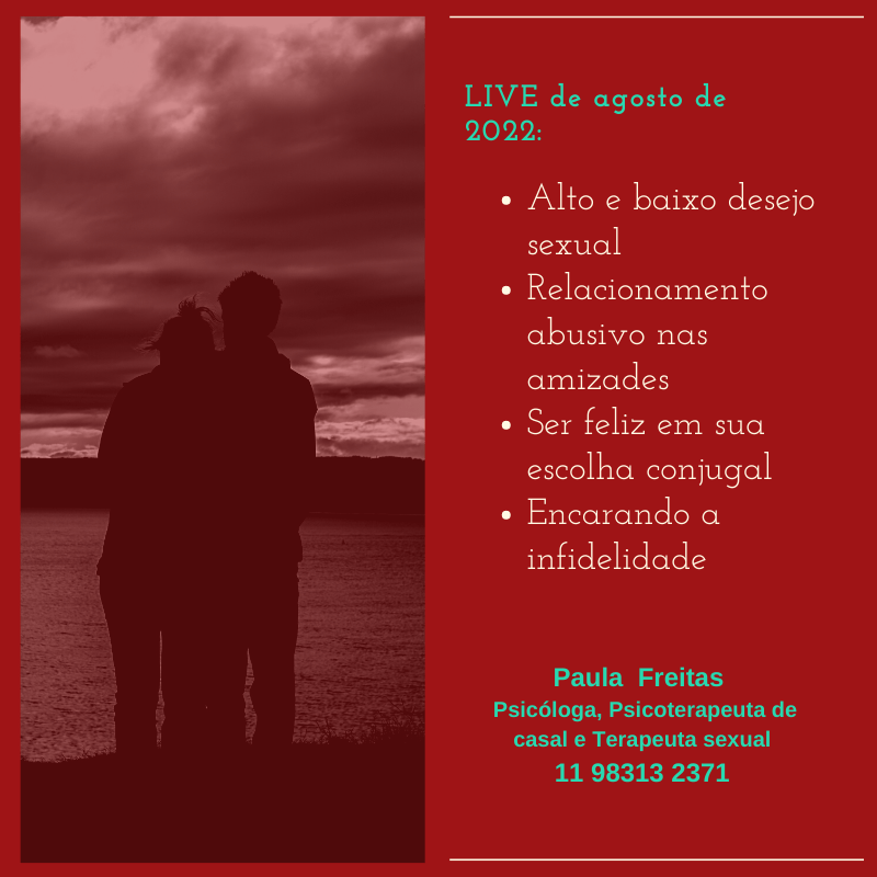 Maratona das LIVE de agosto LIVE 182 – ALTO E BAIXO DESEJO SEXUAL https://www.youtube.com/watch?v=adK7x2qy4Qc LIVE 183 – RELACIONAMENTO ABUSIVO NAS AMIZADES https://www.youtube.com/watch?v=eVXqVgi0aNg&list=PL7Dy9fQByU5CLlqWU2iTKdsC-TC_1PGy1&index=43 LIVE 184 – SER FELIZ EM SUA ESCOLHA CONJUGAL https://www.youtube.com/watch?v=aZxlsN8eBF0&list=PL7Dy9fQByU5CLlqWU2iTKdsC-TC_1PGy1&index=44 LIVE 185 – ENCARANDO A INFIDELIDADE https://www.youtube.com/watch?v=XaIkDmJe_bE&t=878s #livecompsicologa #relacionamentospsicologia #relacionamentospsicologia