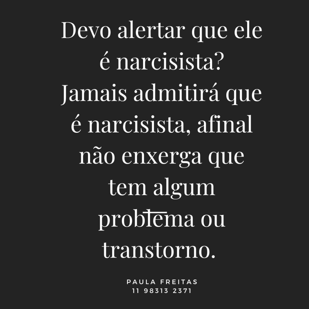 Dificilmente, o narcisista admitirá que é narcisista ou que tem algum transtorno, porque não se enxerga assim, por não ver realmente que tem algo de errado com ele.