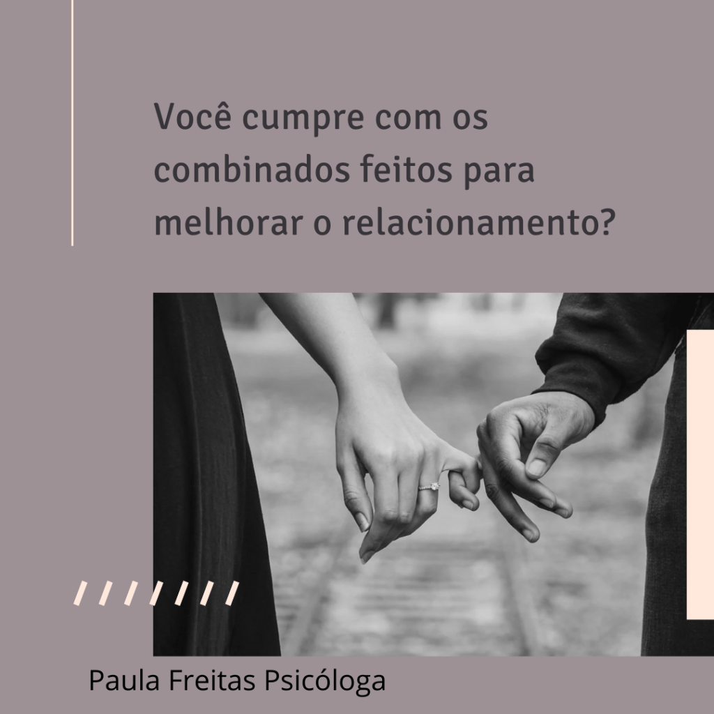 Lembre-se de fazer os combinados antes de irem para qualquer lugar, e nada de leitura mental, que é achar que o parceiro sabe o que você está querendo e pensando sem confirmar se realmente é isso mesmo. Esse é um grande engano que os casais cometem que levam a muitos conflitos. Certifique-se dos acordos e combinados feitos.